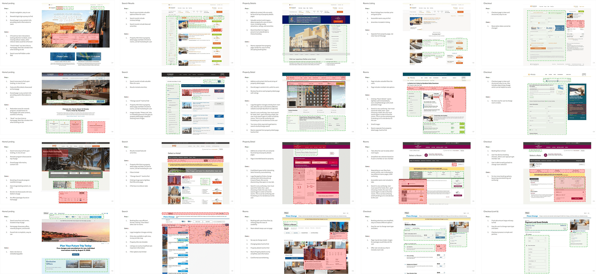 Findings: Excessive and complex steps in the booking flow, poor scannability of room and rate information, accessible color contrast and typography issues, poor mobile optimization, and inconsistent UI patterns across the experience.